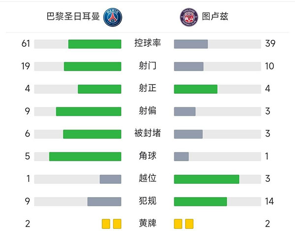 全场比赛结束,最终巴黎圣日耳曼2-1图卢兹。