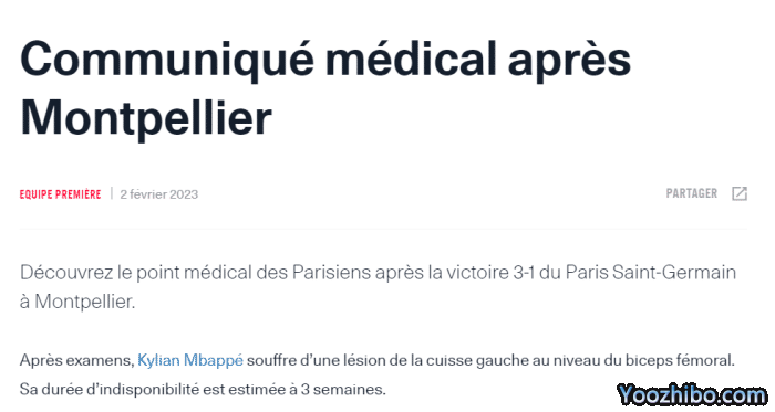 巴黎官方:姆巴佩预计伤缺3周