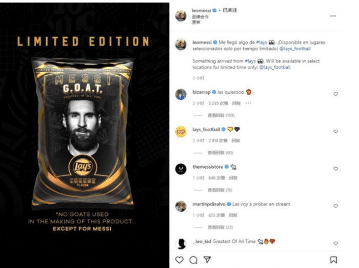 梅西在INS上推广了这款薯片:“乐事的新产品!在限量时间的规定地点有售!”