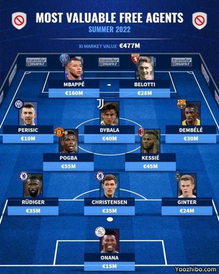24直播网03月29日讯 德国转会市场今日统计了合同年球员最贵阵容,姆巴佩、博格巴和迪巴拉均在其中。