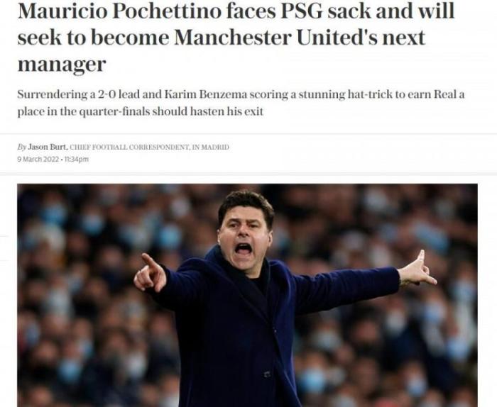 《电讯报》指出,巴黎现在可能解雇波切蒂诺,而总监莱昂纳多的未来也不确定,俱乐部考虑邀请齐达内执教球队,而波切蒂诺离开曼联将进一步加大他执教曼联的可能性。