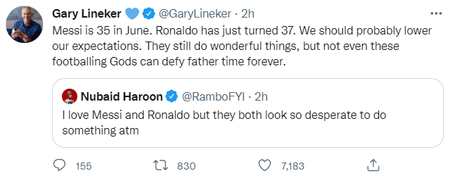 主持人NubaidHaroon表示:“我爱梅西和C罗,但他们两人目前看起来都很挣扎。”