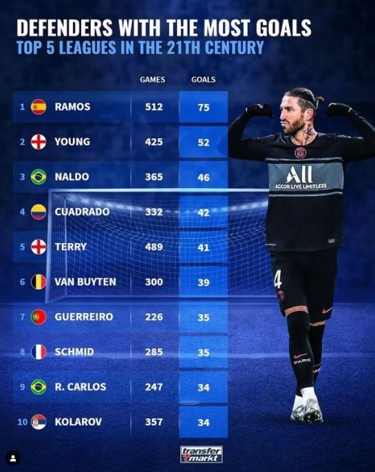 本世纪五大联赛后卫进球榜:拉莫斯75球遥遥领先