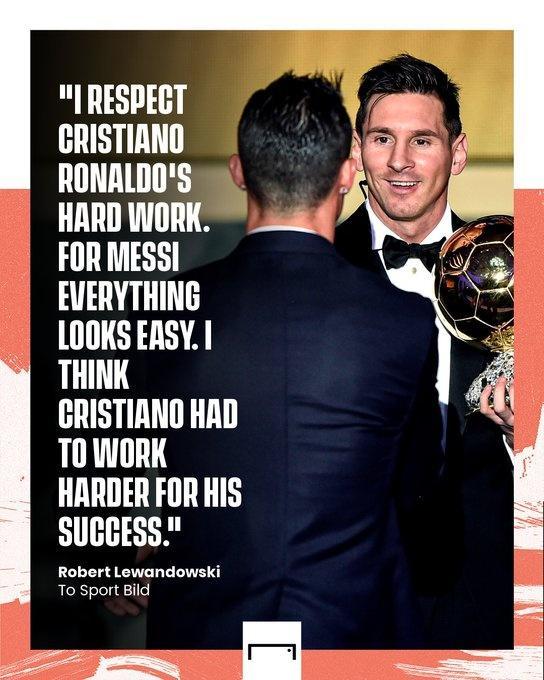 莱万表示:“我尊敬C罗的勤奋。对梅西来说,一切看上去都挺简单。我认为C罗为了取得成功必须更加努力。”