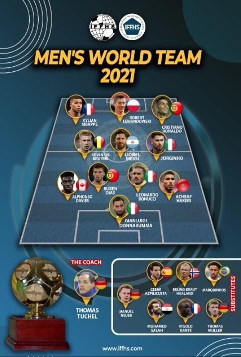 24直播网12月22日讯 IFFHS(国际足球历史和统计联合会)今天公布了2021年度最佳阵容,梅西、C罗和莱万领衔,欧冠教头图赫尔担任教练。