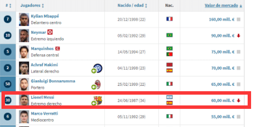 梅西目前的身价在巴黎圣日耳曼队内位居第6,排在他前面的从高到低是姆巴佩、内马尔、马尔基尼奥斯、阿什拉夫和唐纳鲁马。