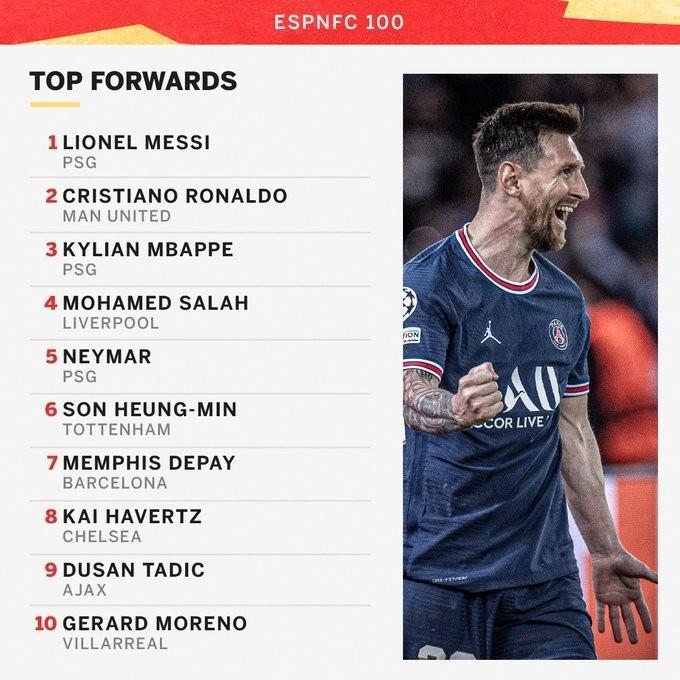 24直播网讯 ESPN评选了2021年年度十大攻击手,梅西、C罗和姆巴佩包揽前三。
