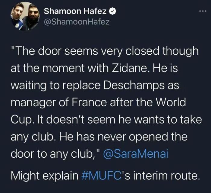 24直播网11月26日讯 据BBC记者ShamoonHafez转发法国记者SaraMenai消息,齐达内只想等德尚离任后接手法国队,目前无意执教任何一家俱乐部。