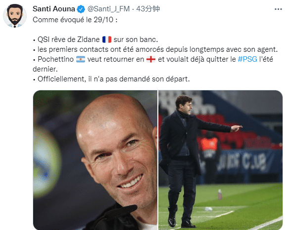 该记者在推特上写道,卡塔尔财团梦想齐达内执教巴黎,他们很早之前就第一次接洽了齐达内的经纪人。