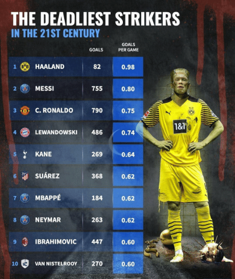 来源:24直播网11-01 15:5924直播网11月01日讯 进球,永远都是足球的主题,那么在本世纪,在足坛谁是进球效率最高的球员呢?近日,德国权威媒体《转会市场网》就盘点了本世纪以来,足坛球星场均进球效率的榜单,其中令人感到意外的是,梅西仅排名第二,而C罗也只排名第三,而排名第一的是哈兰德,他的效率远超梅西和C罗,不知道这个结果是否让您感到意外呢?话不多说,一起看榜单。