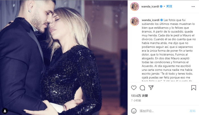 旺达写道:“这段时间的事让我很受伤,我每天都和伊卡尔迪说要离婚,当他意识到我们再也回不去时,他同意了分开。”
