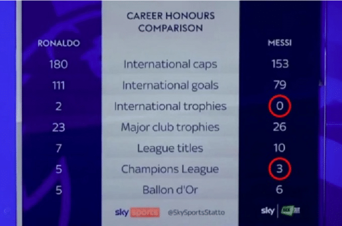 当然,平心而论,梅西的奥运会冠军如果不计算上去,这个没啥。梅西拿到美洲杯冠军,你可以说是今年才获得的,用的是老数据,忘记了。不过,梅西的4个欧冠冠军,都能够被统计成为3个,这要是说不是故意的,估计还真的没有几个球迷会相信,毕竟梅西上一次获得欧冠冠军是15年获得的,距离现在都6年了,《天空体育》总不可能说用的是六年前的数据吧!
