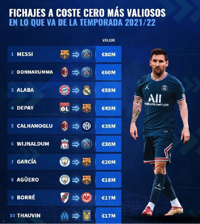 如图,今夏梅西自由转会巴黎,他的身价是8000万欧元。而排名第二的是唐纳鲁马,他离开米兰自由转会加盟巴黎,他的身价是6000万欧元。而第三的是阿拉巴,他离开拜仁自由转会加盟皇马,他的身价是5500万欧元,第四是德佩,他离开里昂自由转会加盟巴萨,他的身价是4500万欧元。第五是恰尔汉奥卢,他离开米兰自由转会加盟国米,他的身价是3500万欧元。