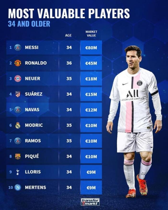 24直播网9月05日讯 今日,德转更新了世界足坛34岁及以上球员的身价榜单,其中梅西8000万欧居首,C罗4500万欧位列次席。