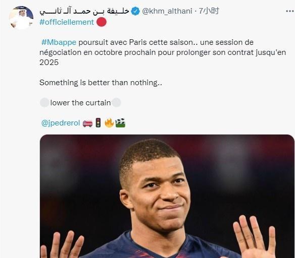 今日据卡塔尔消息人士阿勒萨尼消息,姆巴佩本赛季将会留队,同时大巴黎准备在10月与其续约至2025年。