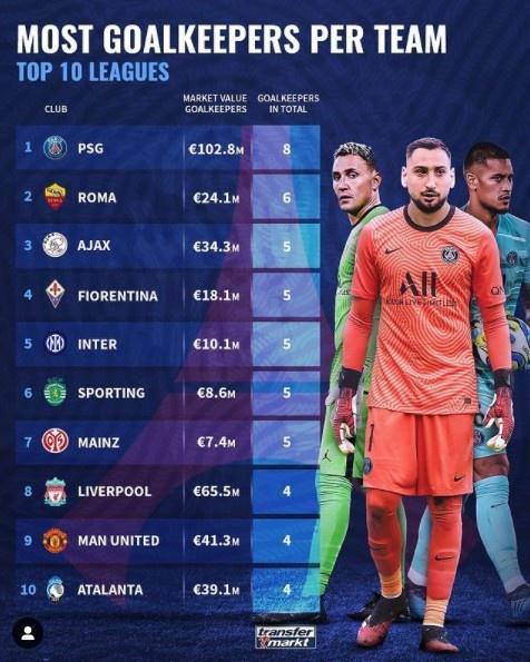 24直播网讯 德国转会市场对单支球队阵中的门将数量进行了统计,其中大巴黎以8位门将排名首位。