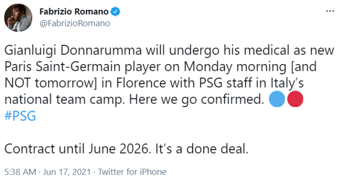 罗马诺: 多纳鲁马下周一接受巴黎体检, 交易已完成