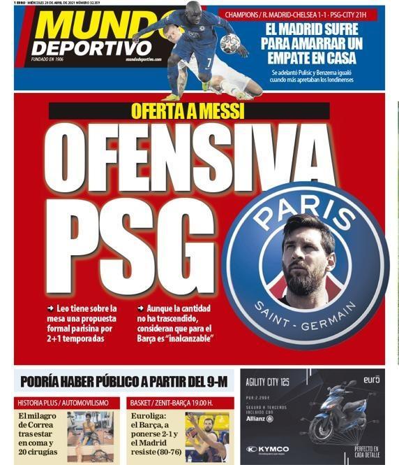 24直播网讯 今日,《世界体育报》在自己的头版中透露,巴黎圣日耳曼给梅西开出报价,但是对于巴萨来说无法匹配。