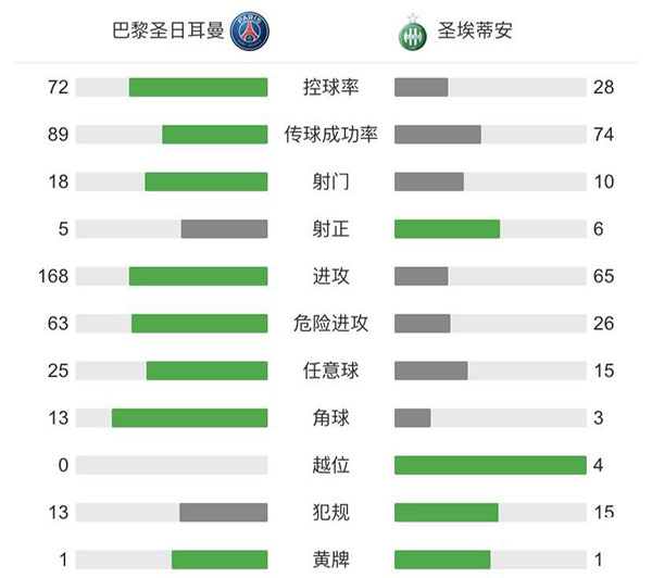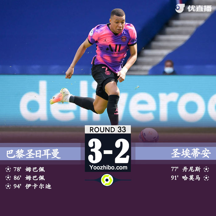 全场比赛结束,巴黎主场3-2圣埃蒂安,与榜首里尔有1分的差距。
