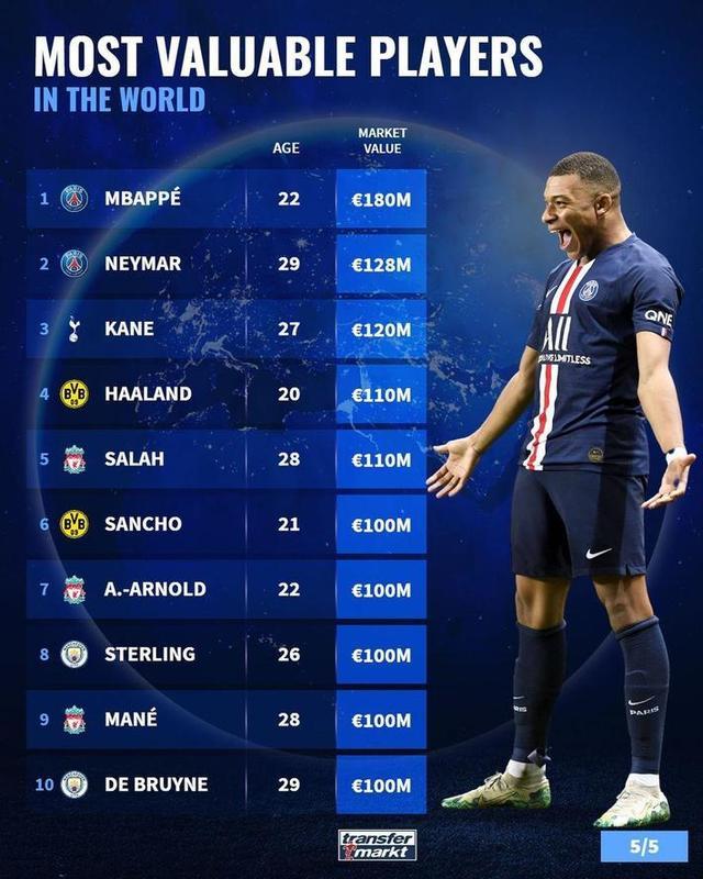 姆巴佩1.8亿欧领跑!球员身价榜公布