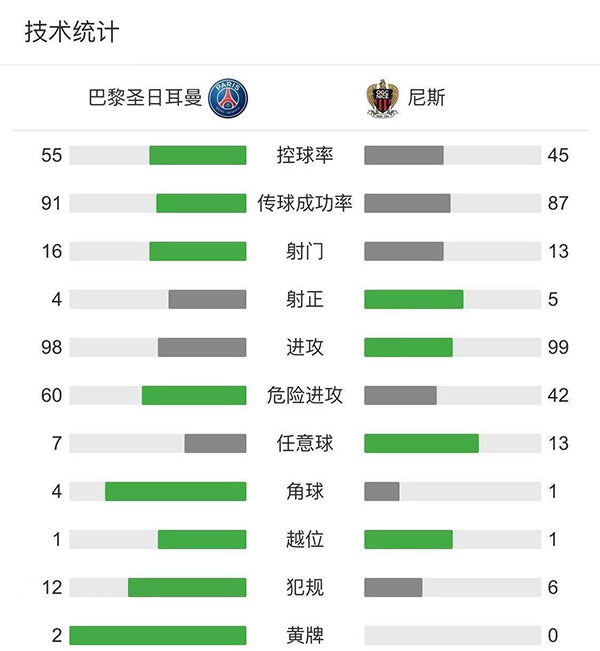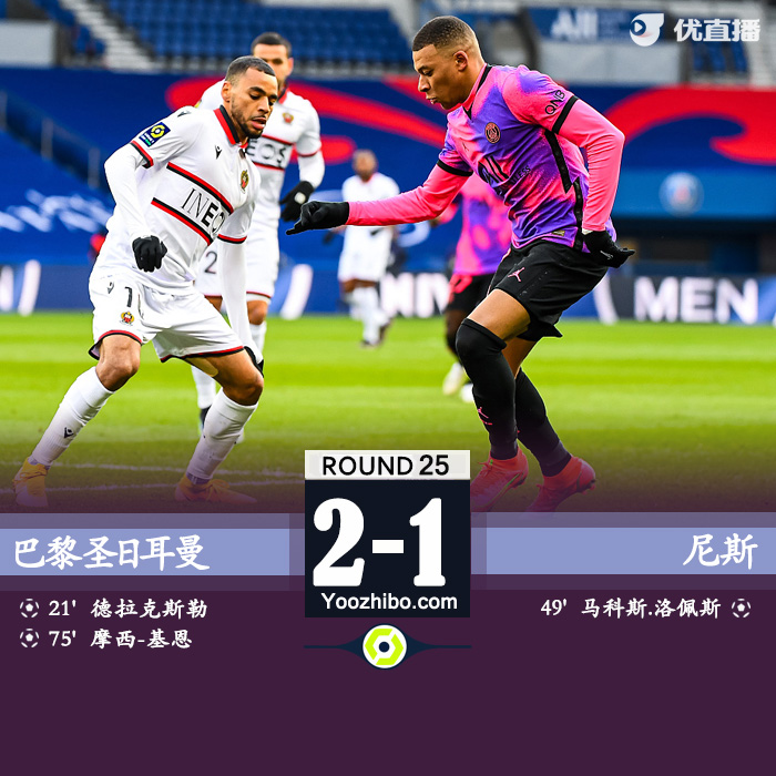 全场比赛结束,巴黎圣日耳曼2-1击败尼斯。