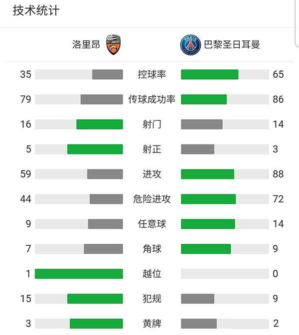 全场比赛结束,洛里昂3-2巴黎圣日耳曼。