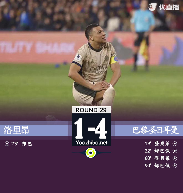 来源:24直播网04-25 03:15 24直播网讯:在法国足球顶级联赛第29轮的比赛中,洛里昂队迎战巴黎圣日耳曼队。上半场登贝莱内切低射破门,随后门德斯传中,姆巴佩门前巧射破门扩大比分。下半场姆巴佩脚下生花,助攻登贝莱破门完成双响,之后班巴头球破门扳回一球,比赛尾声姆巴佩精彩内切破门完成两射一传。最终巴黎4-1战胜洛里昂。