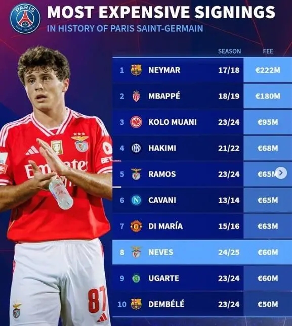 巴黎队史引援榜更新:内维斯加盟位列第八