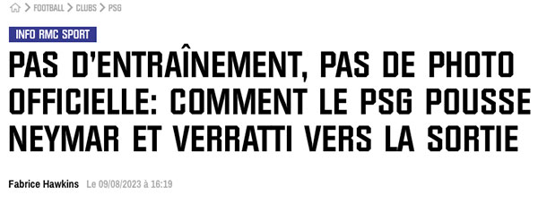 来源:24直播网08-10 17:4324直播网讯08月10日,来自法国知名媒体RMC的最新消息,法甲霸主巴黎圣日耳曼俱乐部已经告知内马尔、维拉蒂等5人,他们不在俱乐部一线队新赛季的计划中,大巴黎鼓励他们在这个转会窗就转会离开。大巴黎此举,大有要在今夏将“大清洗”进行到底的味道。