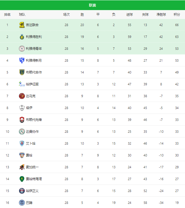 来源:24直播网05-24 15:4924直播网05月24日沙特联赛第28轮结束争夺,吉达联合1-0小胜巴腾,无限逼近联赛冠军。C罗率领利雅得胜利面对利雅得青年,上演让二追三的好戏,3-2掀翻对手,依旧有夺冠的希望。保级的争夺还是很激烈的,接下来我们一起来看看沙特联赛最新排名: