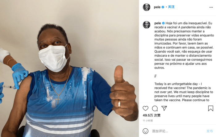 24直播网讯 北京时间3月3日,巴西著名足球运动员贝利接种了由中国研制的新冠疫苗,并分享了接种疫苗时的照片。