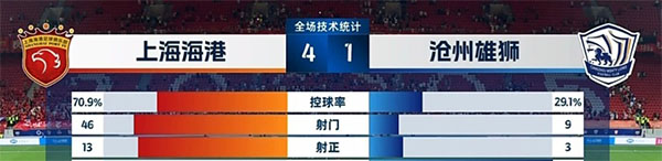 本场比赛,海港派上了4位外援首发,再加上武磊等国脚登场,组成了最强阵容出击。而沧州雄狮则少了王牌外援奥斯卡,双方实力差距进一步拉大。尽管比赛中,沧州雄狮曾一度利用海港后防线失误扳平比分,成功在上半场战成平手,但最终他们还是在下半场顶不住海港冲击连丢3球,最终吞下了1场1-4的完败。