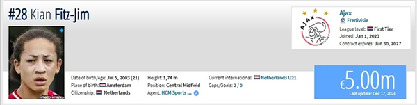 来源:24直播网12-18 11:4724直播网讯北京时间12月17日晚,《德国转会市场》网站更新了荷甲球员的最新身价,而备受关注的21岁华裔天才菲慈佔-天乐,最新身价已经暴涨至500万欧元。
