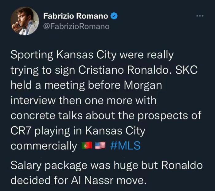24直播网12月31日讯 据知名转会专家罗马诺报道,美职联球队堪萨斯城曾经重金邀请C罗,但他最终选择去沙特踢球。