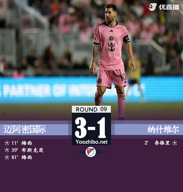迈阿密3-1纳什维尔 梅西两射一传,布斯克茨破门