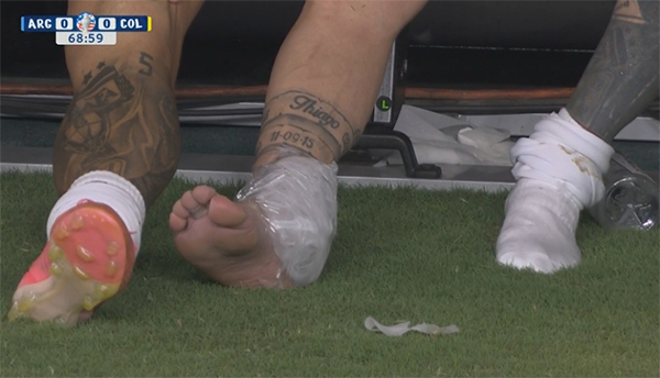 从直播镜头拉近的细节可以看到,梅西右脚的鞋袜已经脱掉,敷上了厚厚的冰袋。不知道这次脚踝受伤,是否会让梅西远离赛场一段时间。