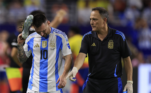 本场决赛,阿根廷遭到了哥伦比亚的顽强狙击,而梅西更是受到哥伦比亚球员的重点照顾。比赛第36分钟,梅西就在一次传中后遭到阿里亚斯踩脚踝倒地痛苦翻滚,并且一度到场外接受治疗。