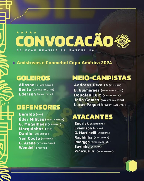 来源:24直播网05-11 15:2924直播网讯 北京时间5月10日晚,巴西a男足临时主帅公布了美洲杯23人参赛名单。威尼休斯、罗德里戈、米利唐、马尔基尼奥斯、埃德森、阿利松、拉菲尼亚等名将悉数入围,皇马17岁天才恩德里克也在列。头号球星内马尔因伤缺席,阿森纳射手热苏斯和曼联后腰卡塞米罗、边锋安东尼则遗憾落选。同样无缘名单的还有热刺射手理查利森、尤文中卫布雷默。