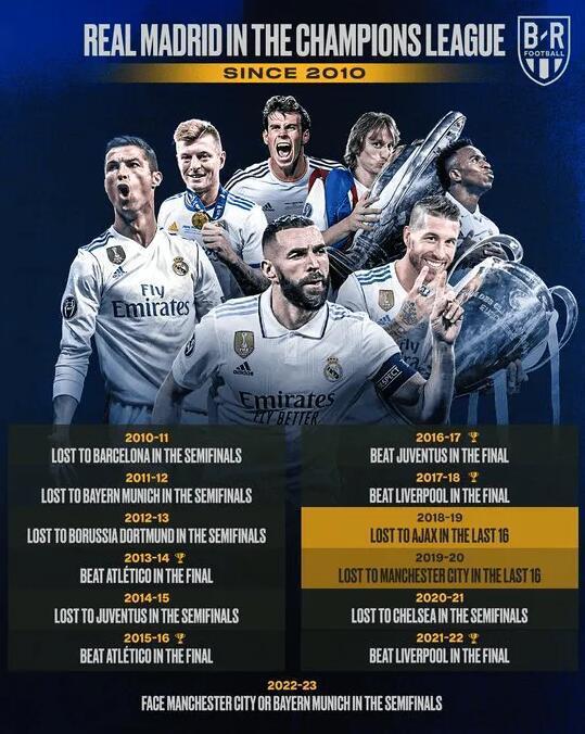 在过去的13个赛季中,皇马有11个赛季都晋级了半决赛,只有18-19、19-20两个赛季止步十六强。