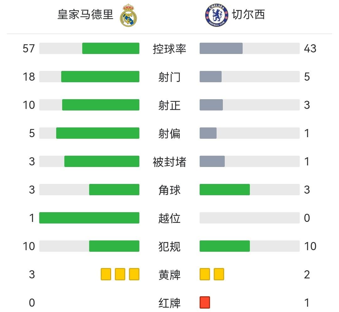 来源:24直播网04-13 05:08 24直播网讯:北京时间4月13日03:00,欧冠1/4决赛首回合迎来一场焦点大战,皇家马德里坐镇主场伯纳乌球场迎战切尔西,本场主裁判为勒泰西耶。上半场,菲利克斯开场失单刀,本泽马补射破门。下半场,库利巴利伤退,奇尔韦尔利用犯规破坏罗德里戈绝佳机会被直红罚下,维尼修斯助攻替补登场仅3分钟的阿森西奥贴地斩锁定胜局。最终,皇马主场2-0力克十人切尔西。