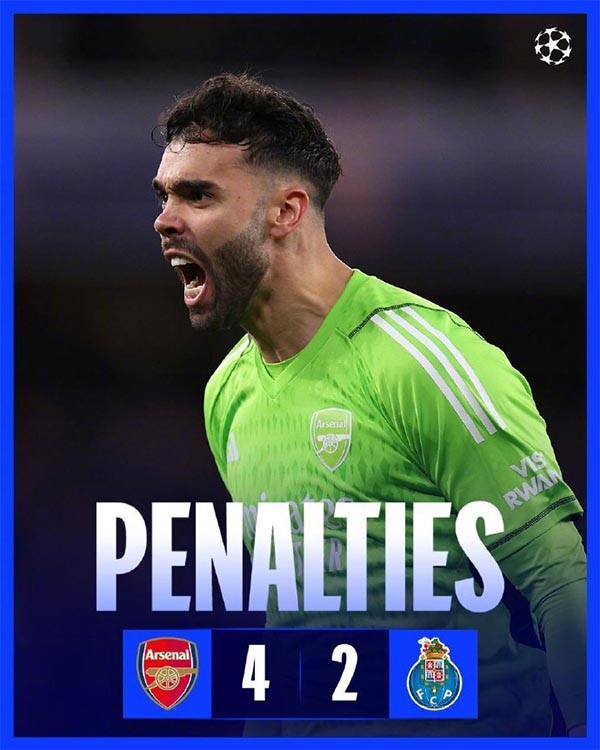 在阿森纳主场与波尔图的比赛中,上半场厄德高助攻特罗萨德打破僵局扳平总比分。易边再战和加时赛,双方都没能破门。而在残酷的点球大战中,阿森纳门神拉亚2次扑点,最终阿森纳总比分5-3淘汰波尔图,晋级8强。