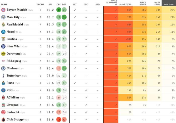 24直播网讯02月24日FiveThirtyEight数据统计各队欧冠夺冠概率。