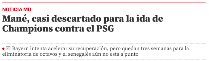 《世体》称,虽然马内的恢复状况不错,但他依然赶不上与巴黎的欧冠首回合比赛。