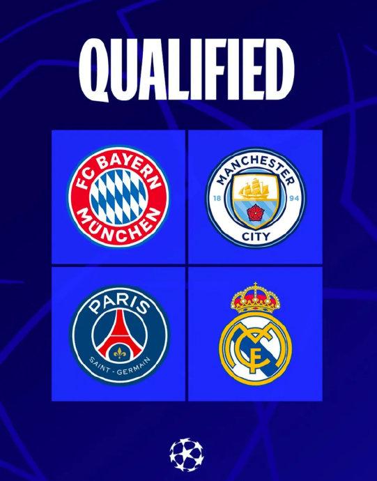欧冠八强出炉4席:皇马巴黎联赛第一 曼城拜仁第二