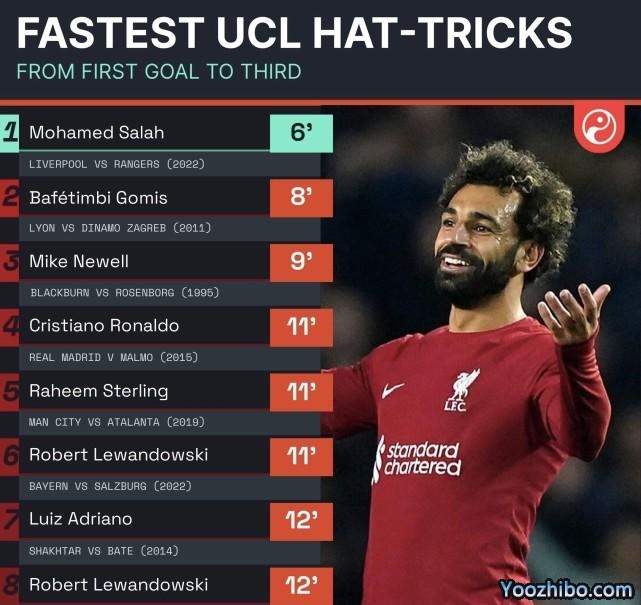 据统计,这是欧冠历史上最快的帽子戏法。此前欧冠最快戴帽纪录是2011年里昂与萨格勒布迪纳摩的比赛中,戈米创造的,时间为8分钟。萨拉赫直接将纪录缩短了2分钟。值得注意的是,萨拉赫3个进球都是若塔助攻的。葡萄牙国脚也创造了欧冠最快助攻帽子戏法的纪录。之前的纪录,是2012年里贝里助攻戈麦斯创造的。