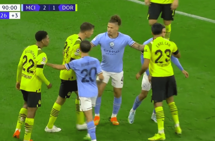 下半场的比赛来到第57分钟的时候,多特蒙德利用角球的机会率先打破场上僵局,厄兹詹头球过度,罗伊斯一脚似传似射,贝林厄姆头于破门,此后两队接连作出换人调整,比赛来到第80分钟的时候,曼城队终于扳平了比分,斯通斯一脚世界波轰开了对方的球门,这记射门势大力沉,迈尔基没有做出任何的扑救反应。仅仅过去了3分钟后,坎塞洛左路外脚背传中,禁区内哈兰德踹射破门,曼城反超了比分,剩下的时间两队都没有取得进球,最终全场比赛结束,曼城2:1逆转战胜多特蒙德。