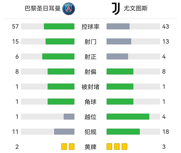 全场比赛结束,巴黎圣日耳曼主场2-1战胜尤文图斯。
