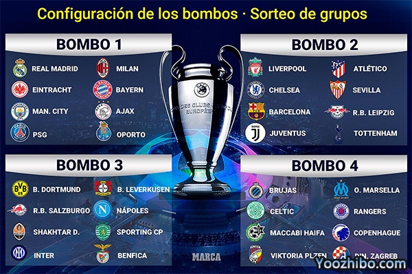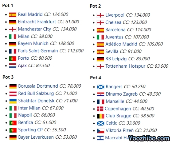 第一档:皇家马德里(卫冕冠军)、曼城(英超冠军)、拜仁慕尼黑(德甲冠军)、米兰(意甲冠军)、巴黎圣日耳曼(法甲冠军)、波尔图(葡超冠军)、阿贾克斯(荷甲冠军)、法兰克福(欧联杯冠军)