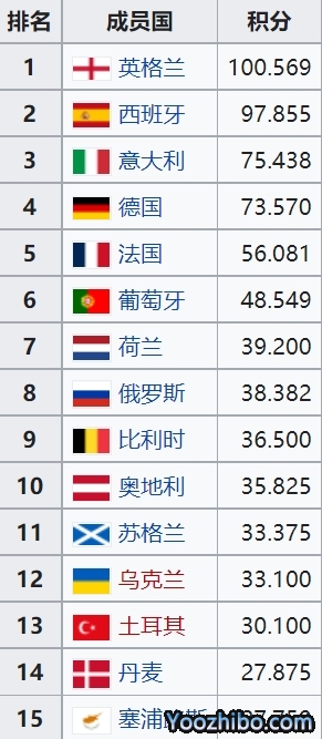 附2020-21赛季结束后,欧战积分排名前15位的协会为: