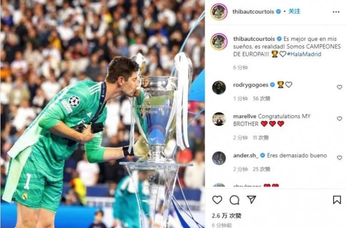 库尔图瓦晒出了自己亲吻欧冠奖杯的照片,并表示:“这比我梦里还要美好,而这是现实!我们是欧洲冠军!”
